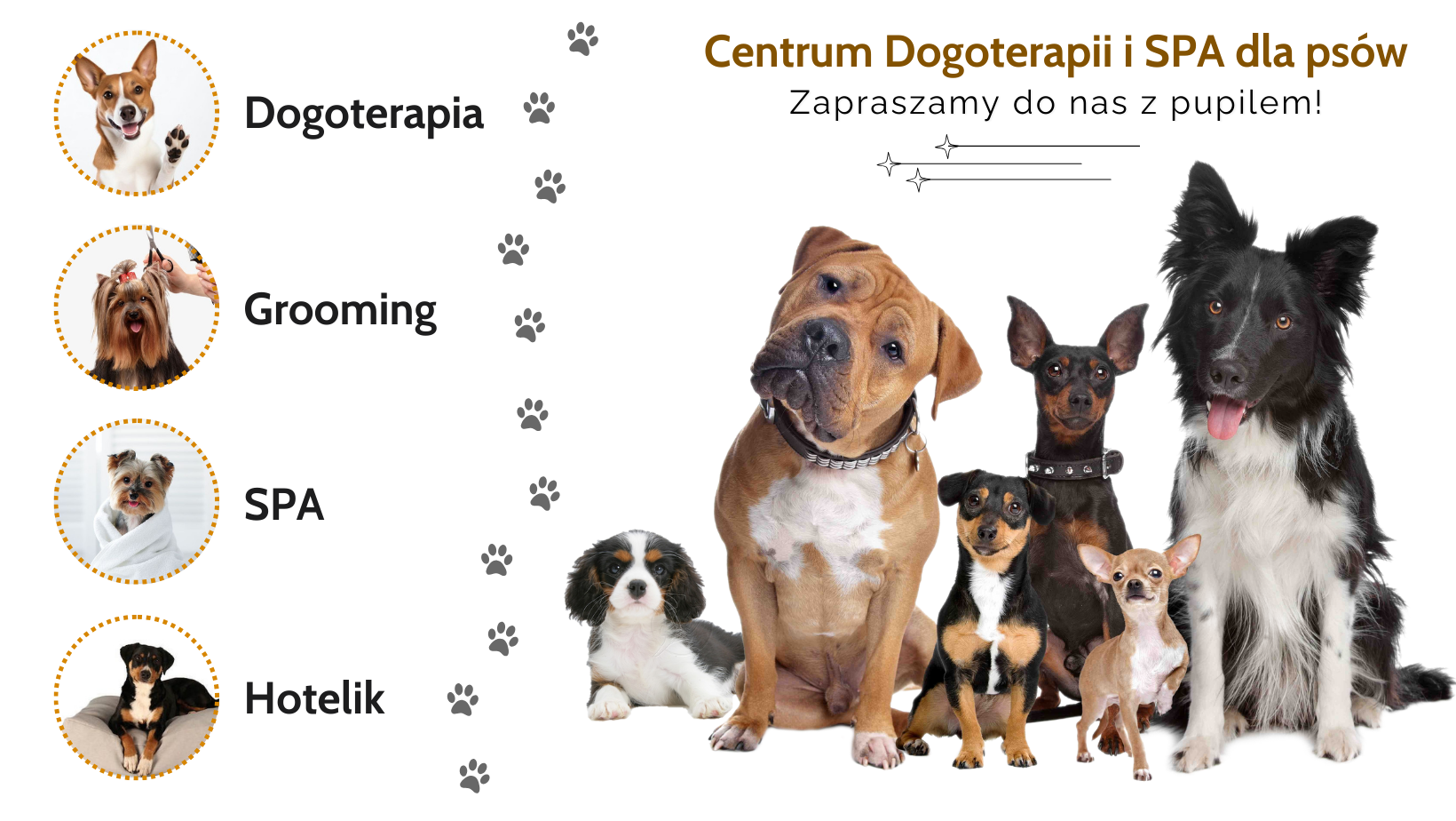 W Centrum Dogoterapii i Pielęgnacji Psów wierzymy, że każdy pies zasługuje na miłość, troskę i profesjonalną opiekę. Nasze Centrum to wyjątkowe miejsce stworzone z pasji do zwierząt, w którym oferujemy usługi dogoterapii, spa, groomingu oraz hoteliku dla psów. Dbamy o zdrowie, wygląd i dobre samopoczucie Twojego pupila, dostosowując naszą ofertę do indywidualnych potrzeb każdego czworonoga.